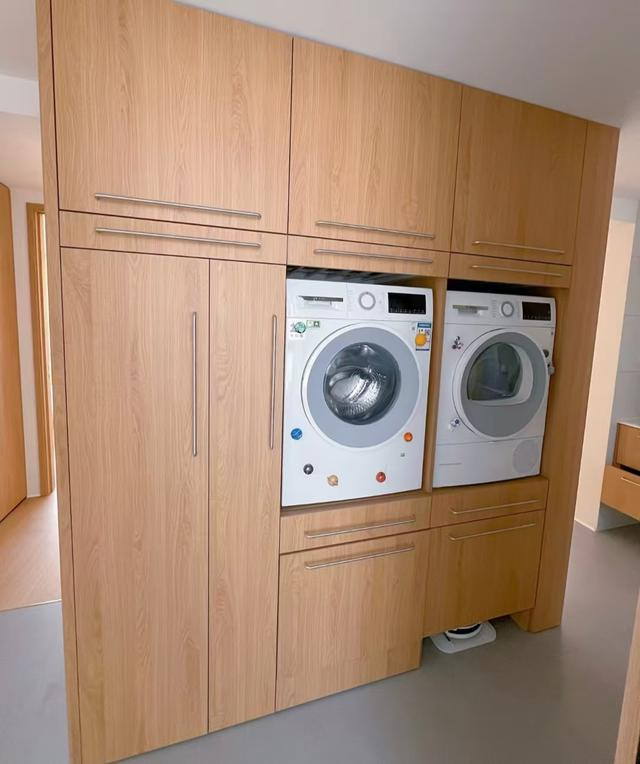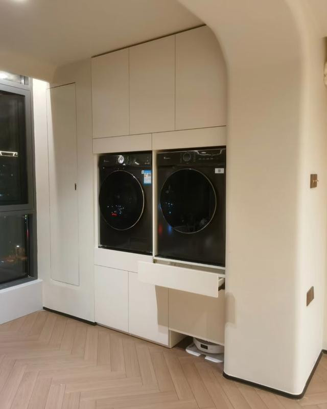 于是参考了网红设计把洗烘套装嵌入柜子里并且做了抬高,这样不管是看起来还是用起来也都更方便了。